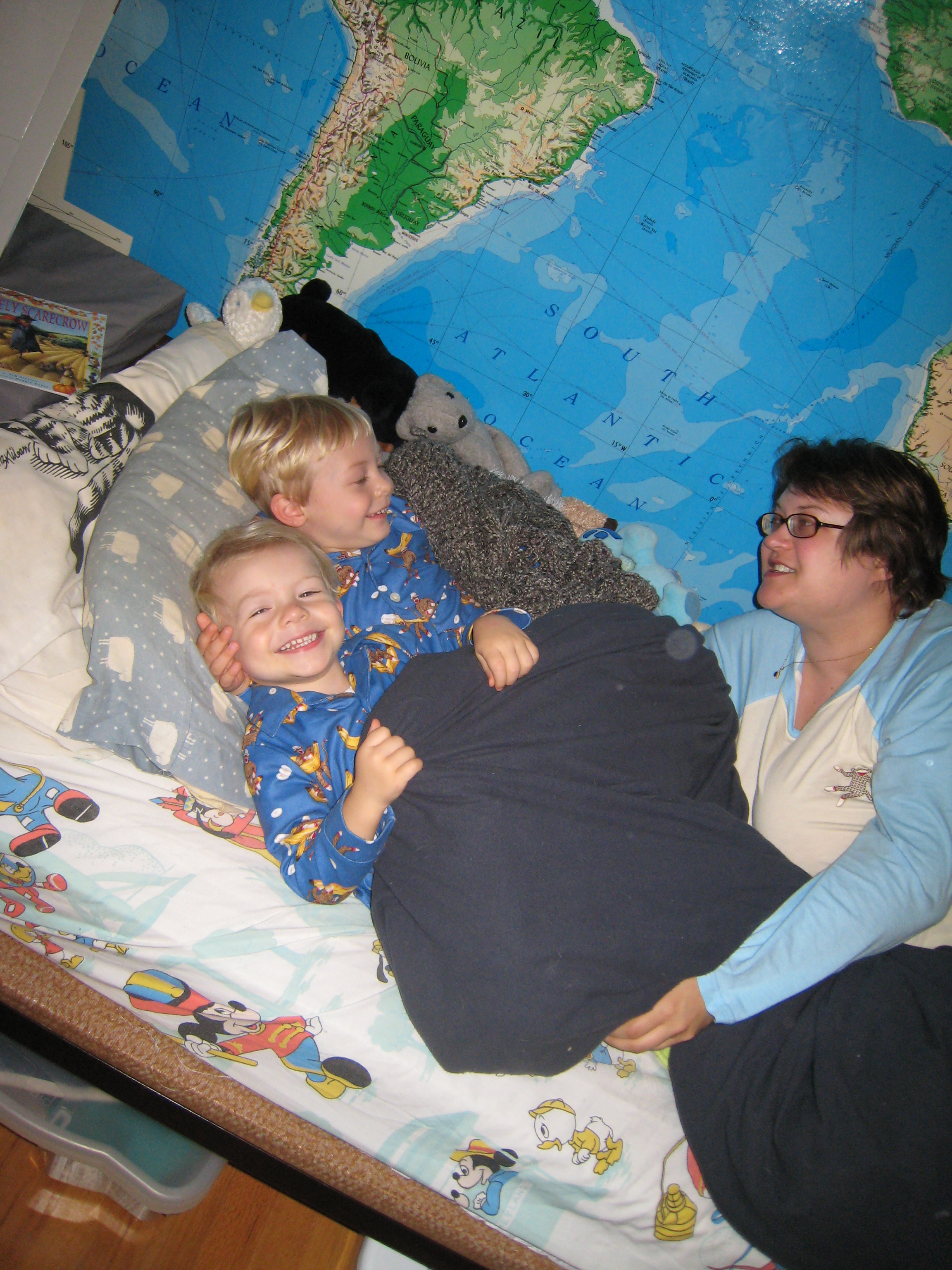 Cole, Tim and Christine in monkey jammies (10-17-2007 20:15)