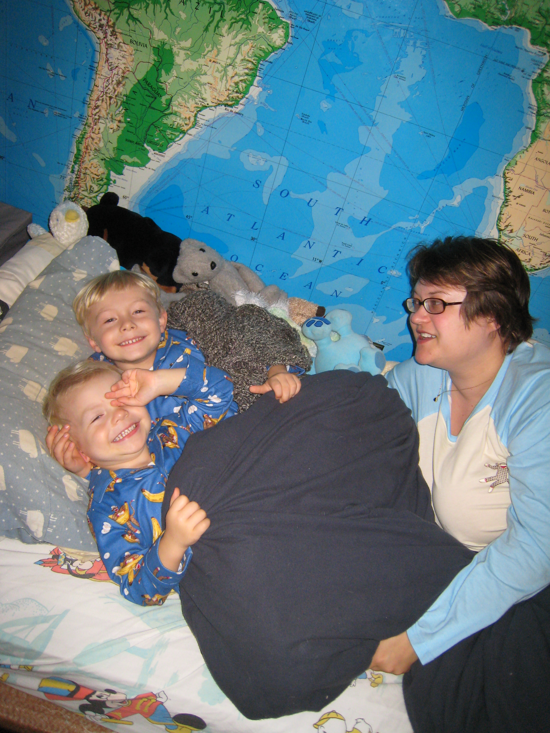 Cole, Tim and Christine in monkey jammies (10-17-2007 20:15)