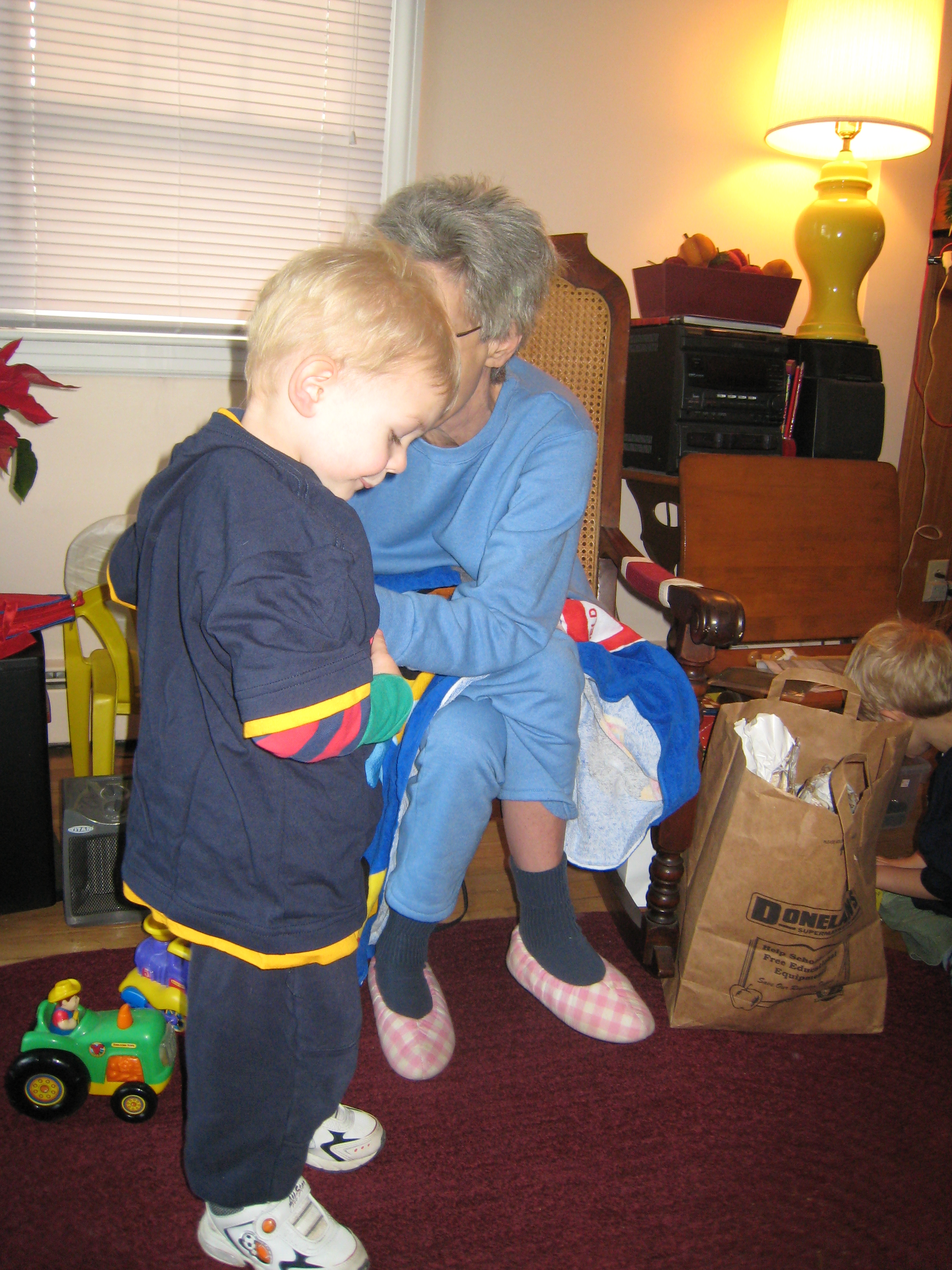 Nea putting a Spider Man shirt on Cole (12-25-2007 10:35)