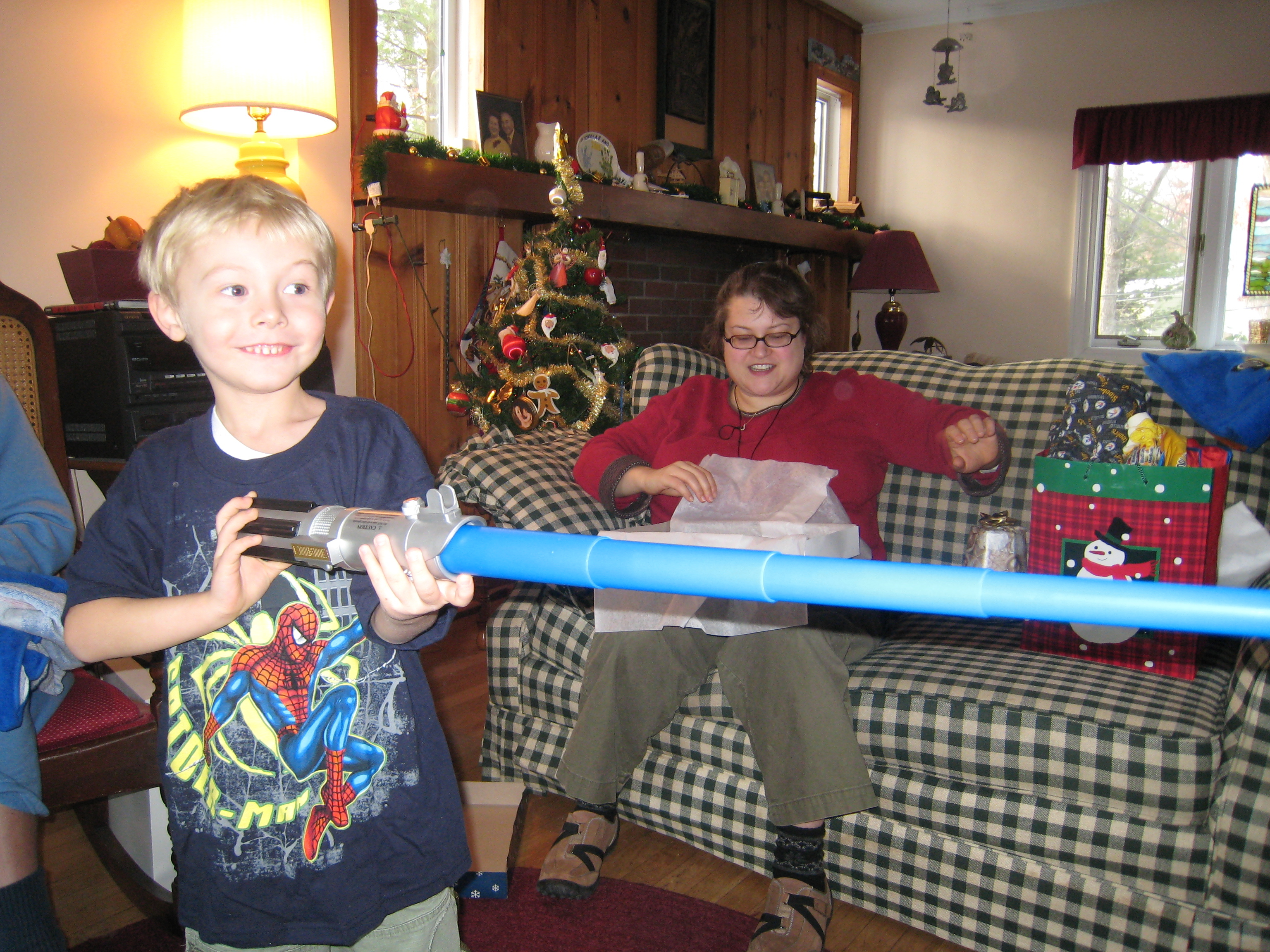 Mommy's Steelers boxers, Tim practicing his saber moves (12-25-2007 10:36)