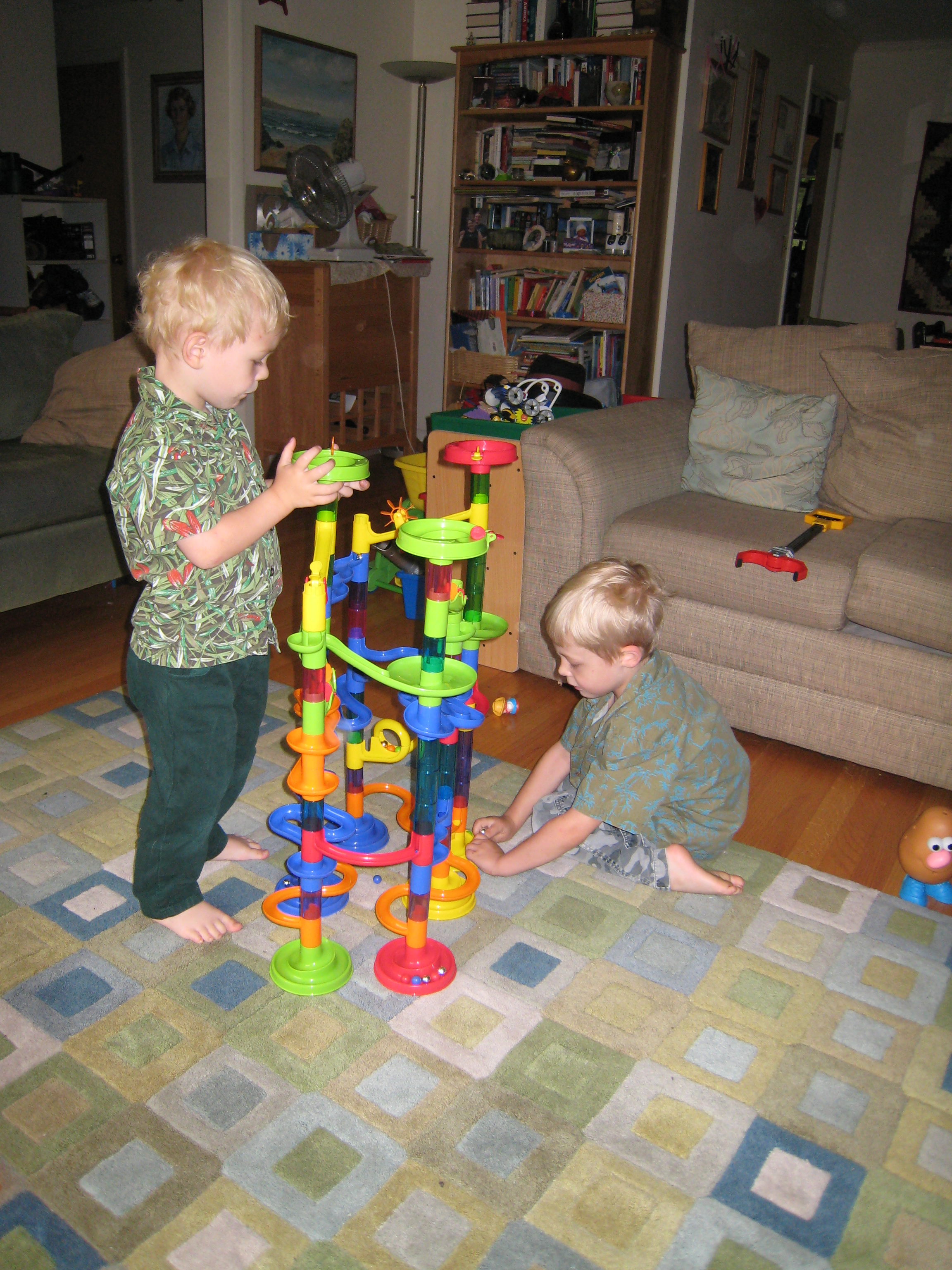 Cole and Tim playing with the marble run (06-16-2008 07:09)
