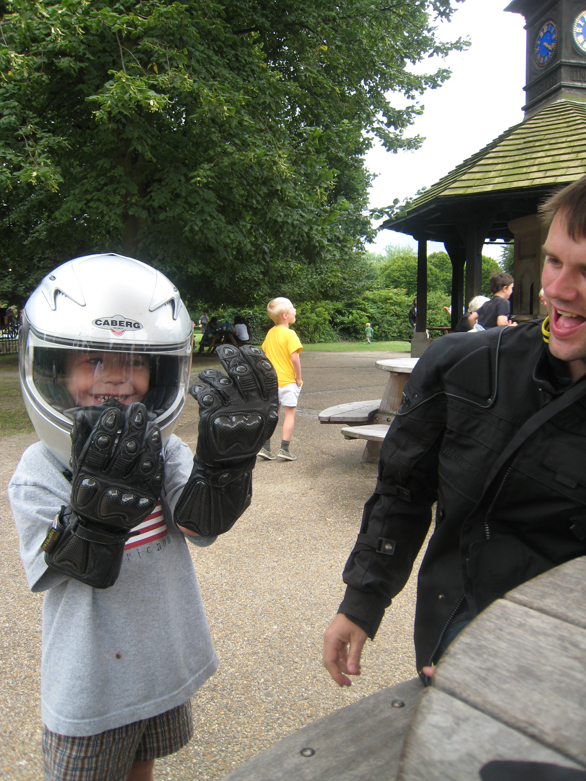Ben's gallery: /242/349 - Cole with a motorcycle helmet on with Johnny and Tim.jpg