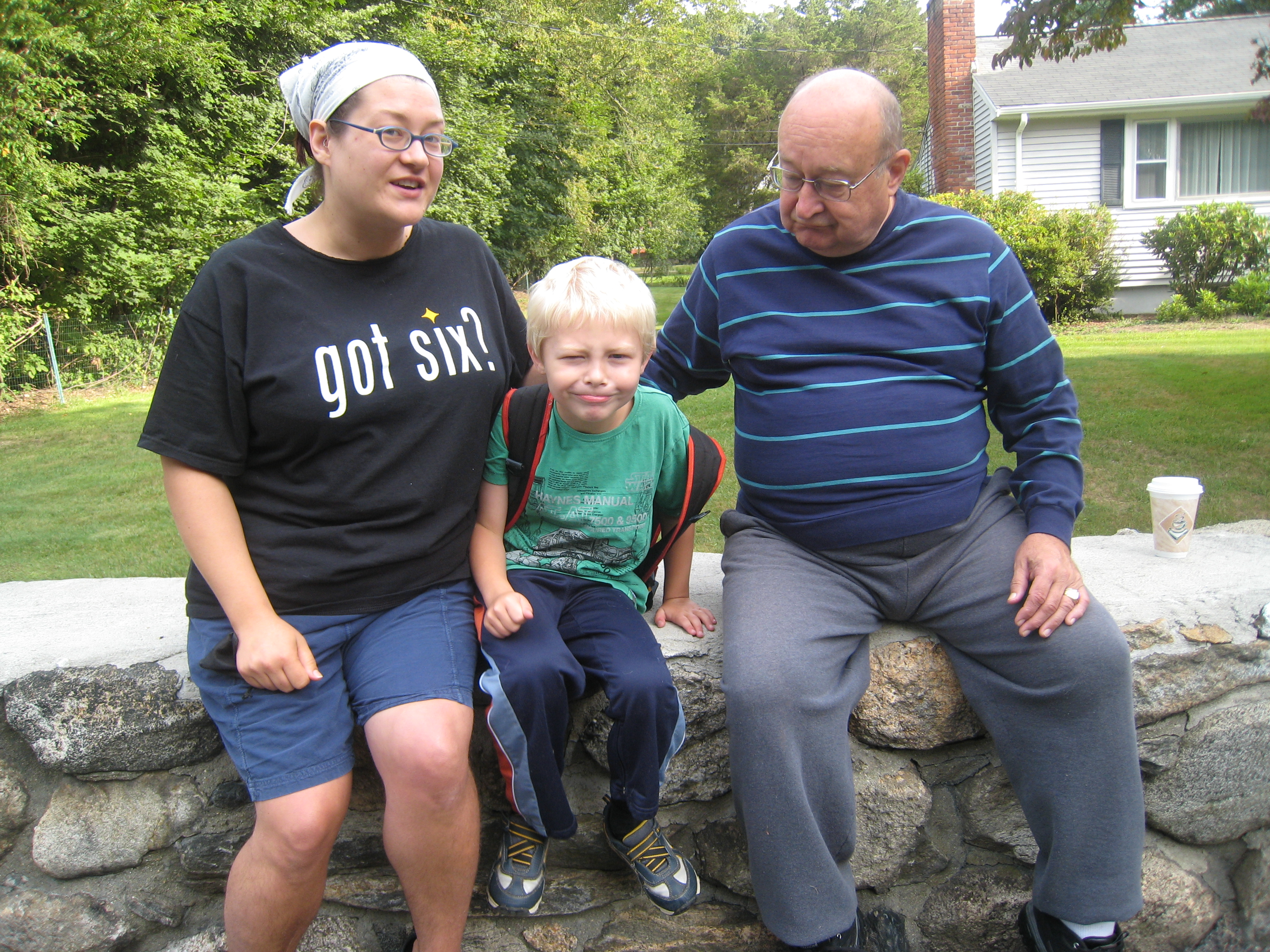 Xine, Tim and Poppy at the bus stop (09-08-2009 07:39)