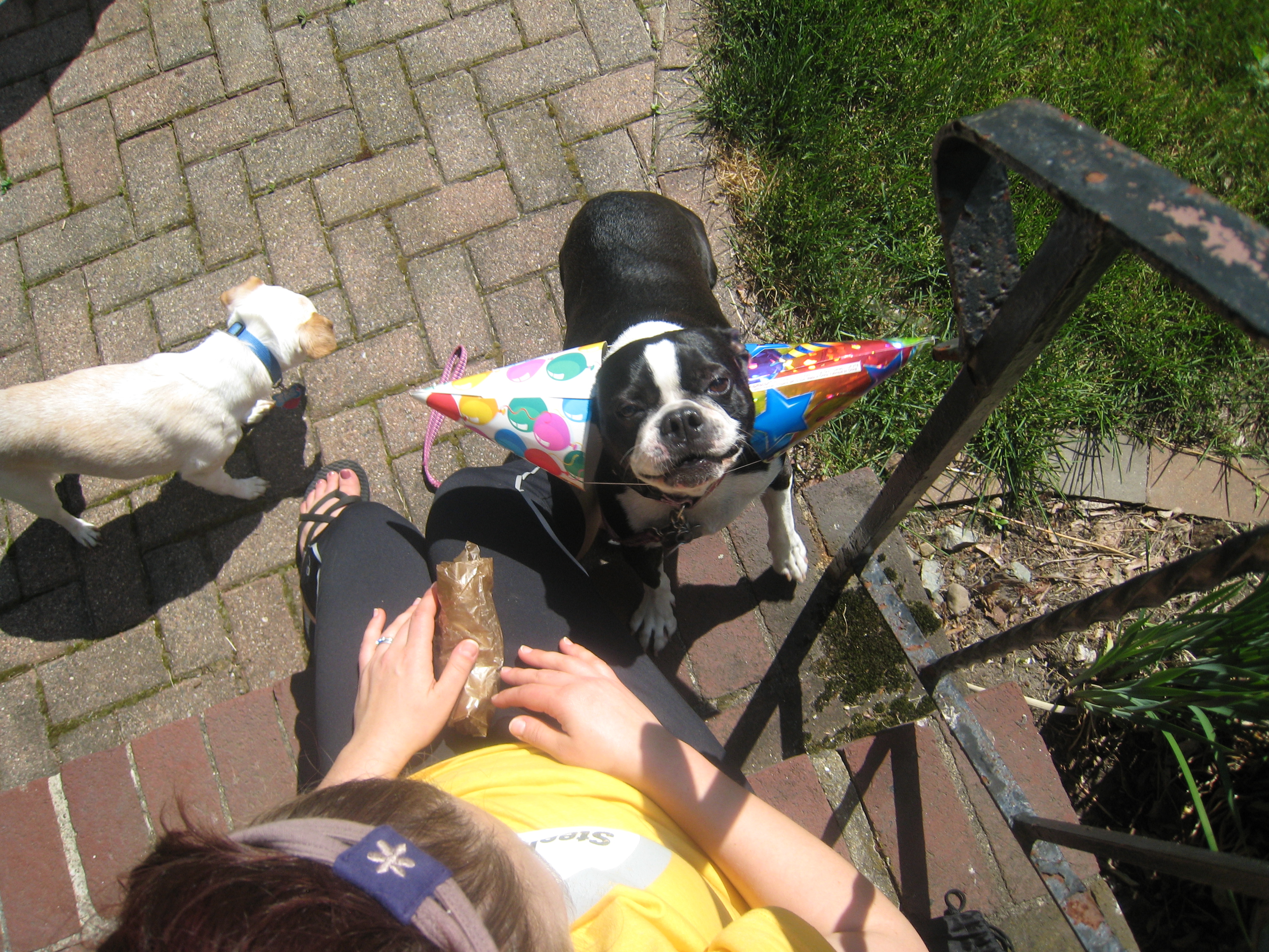 Xine and Emily and Bruno (sporting his party hats) (05-05-2010 13:55)