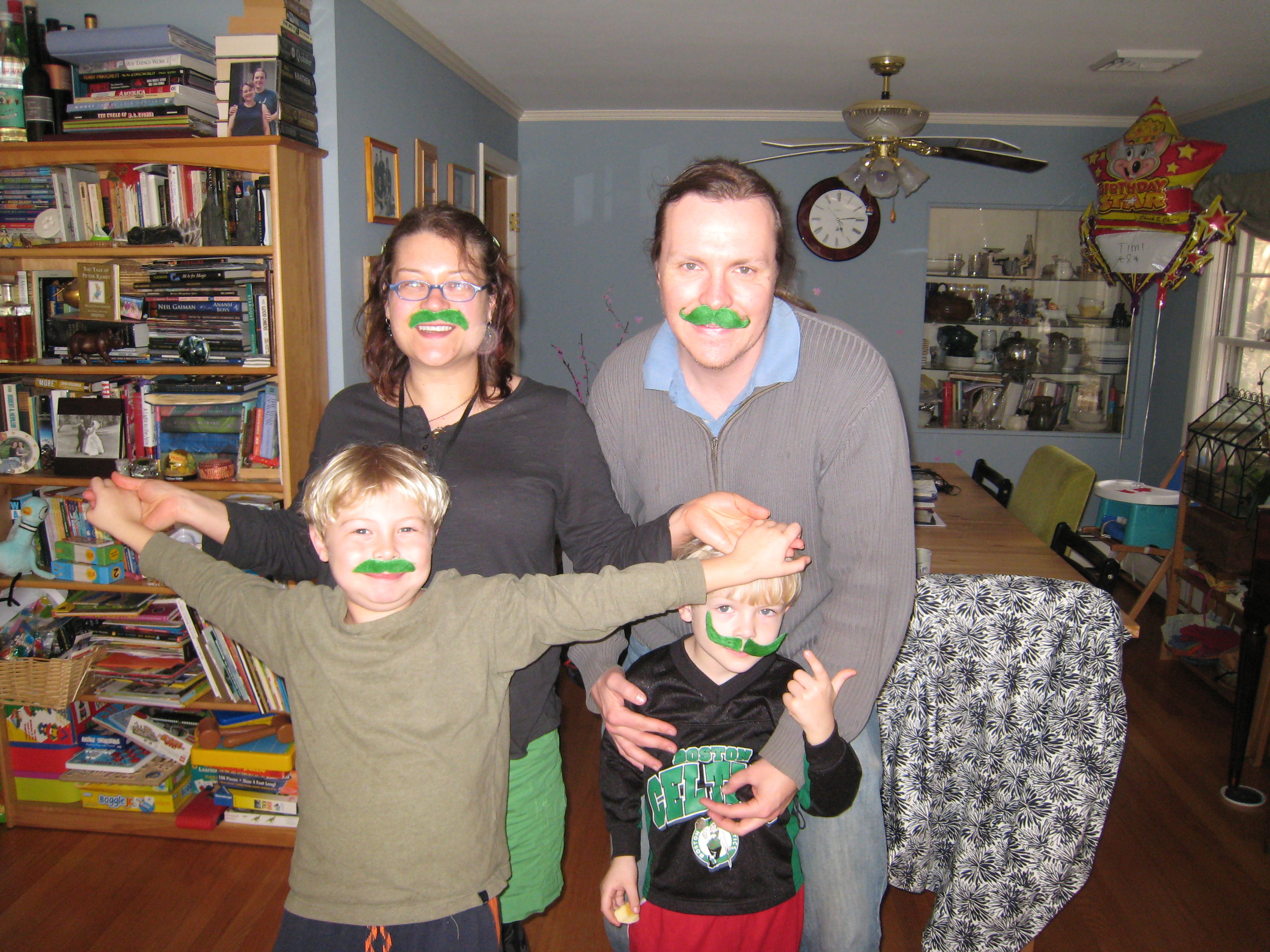 Xine, Ben, Tim, Cole in green moustaches (03-17-2011 16:14)