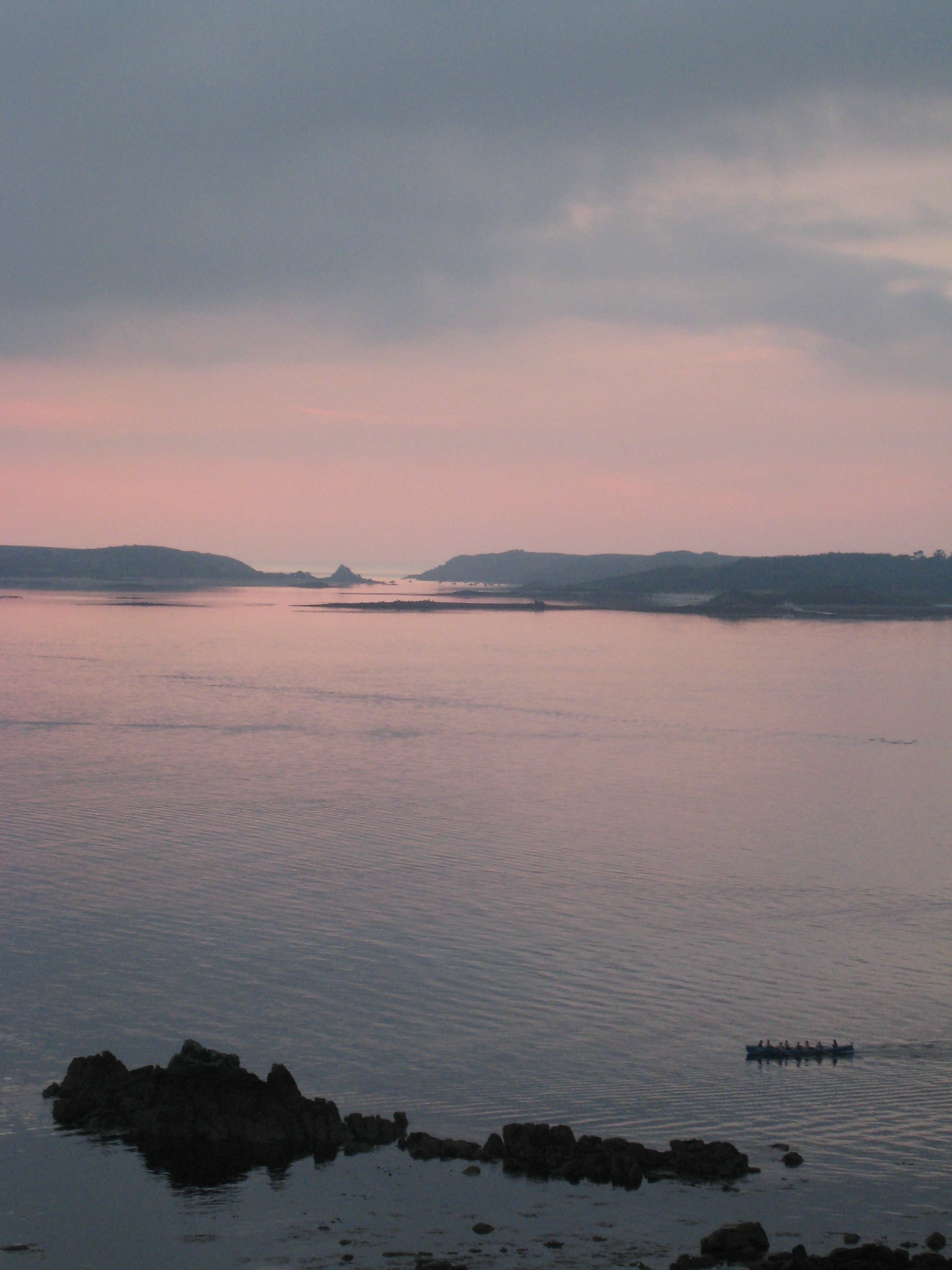 Gig racers row home in front of Bryher and Tresco at sunset (07-13-2011 21:24)