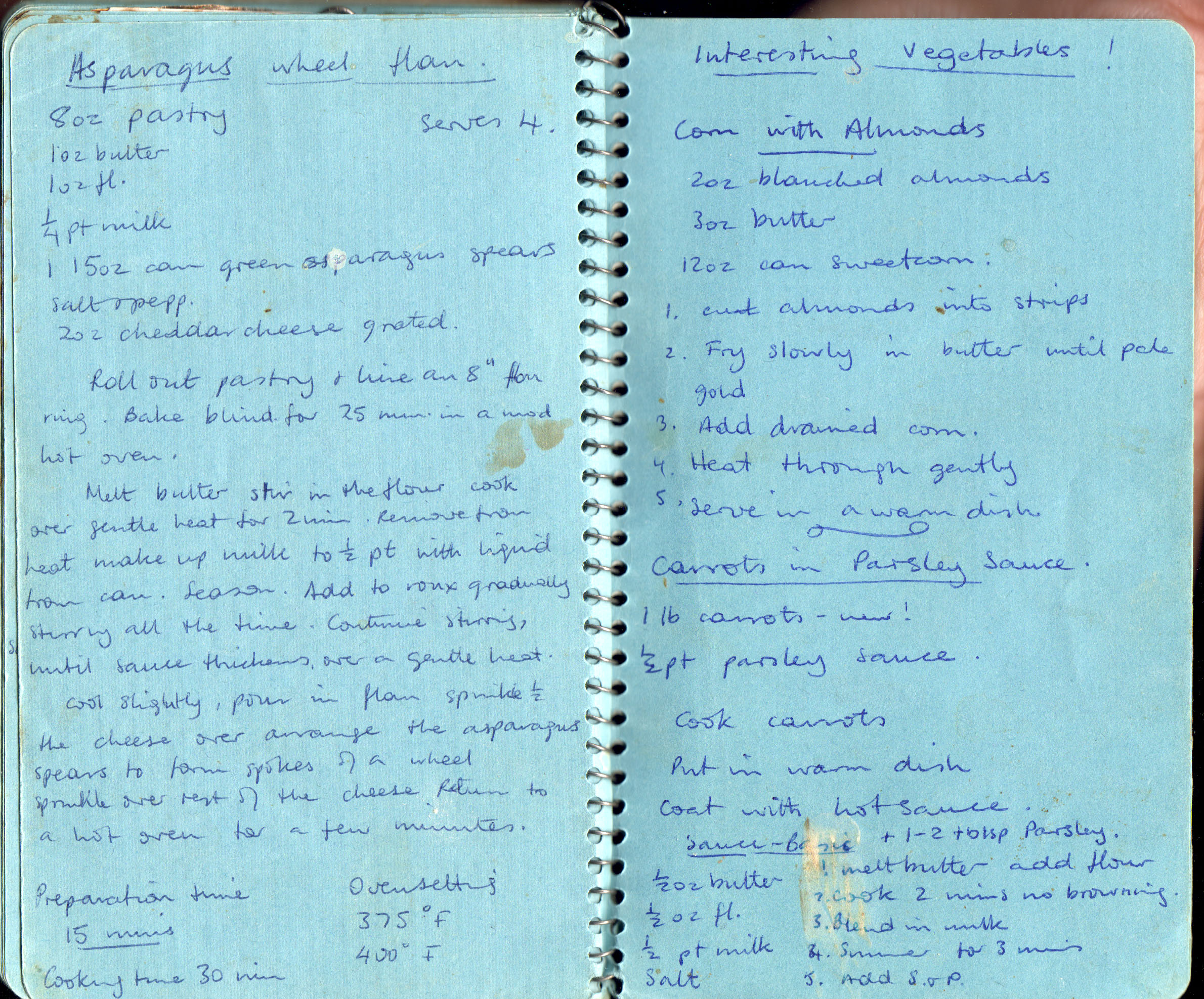 Asparagus Wheel Flan (serves 4); Interesting Vegetables!; Carrots in parsley sauce